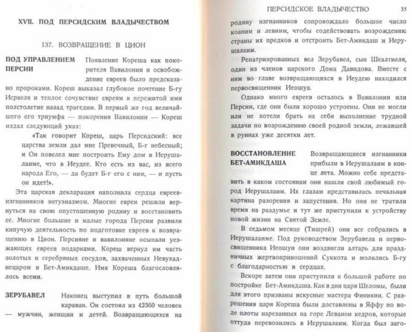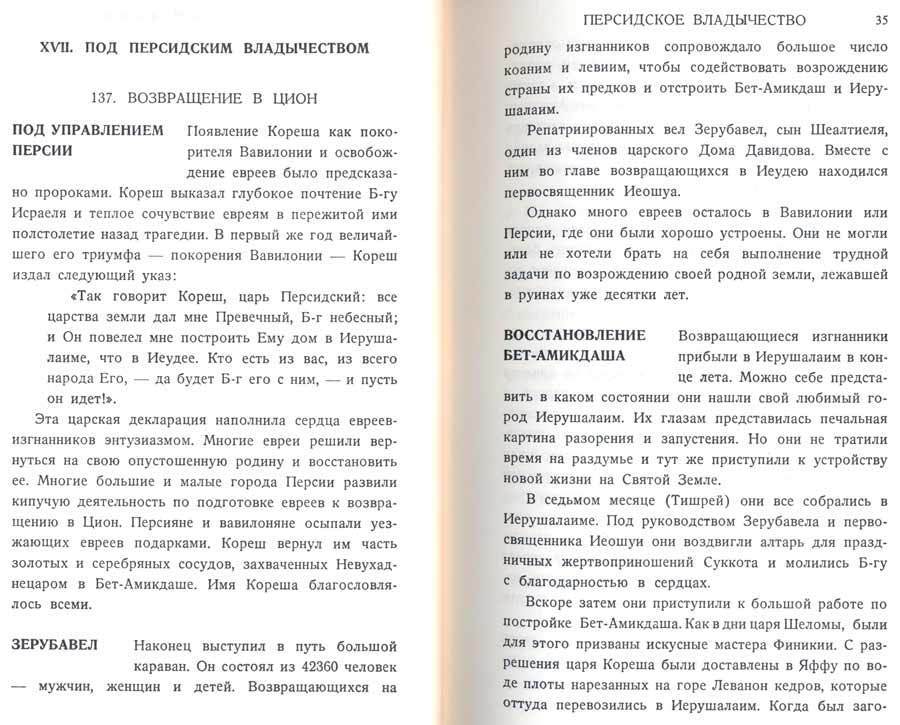 По всему материалу, изложенному в этой книге, красной нитью проходит идея Божественного Провидения, направляющего судьбу нашего народа, и проводится мысль, что эта судьба тесно связана с великой миссией и задачей, возложенных на нас, как на «Царство священников и святого народа»; задачей, обязательной не только для нашего народа в целом, но и для каждого из его сыновей и дочерей в отдельности. Благодаря всему этому, каждый еврейский ребенок, изучающий еврейскую историю по этому учебнику, почувствует гордость и достоинство от сознания того, что он еврей или еврейка. Лучше понимая настоящий смысл истории своего прошлого, ребенок сумеет более полно оценить и понять смысл исторических событий как в нашей повседневной жизни, так и нашего будущего. Это позволит нашим детям, когда они подрастут, найти правильный ответ на многие сложные вопорсы, занимающие лучшие умы наших современников.