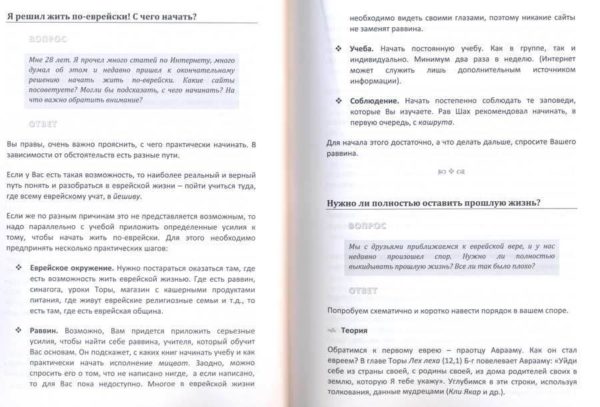 Перед Вами, уважаемый читатель, сборник вопросов и ответов, в которых можно найти попытку обсуждения подобных проблем. Они собраны из ранее изданных публикаций и переработаны автором для настоящего издания. Ответы не претендуют на полноту освещения каждой из затронутых тем и не входят во всю глубину обсуждаемых проблем. Их основная цель: дать на часть возникающих у баалей-тшува вопросов простые и практичные ответы, которые помогут им сориентироваться в начале своего пути к еврейской жизни.